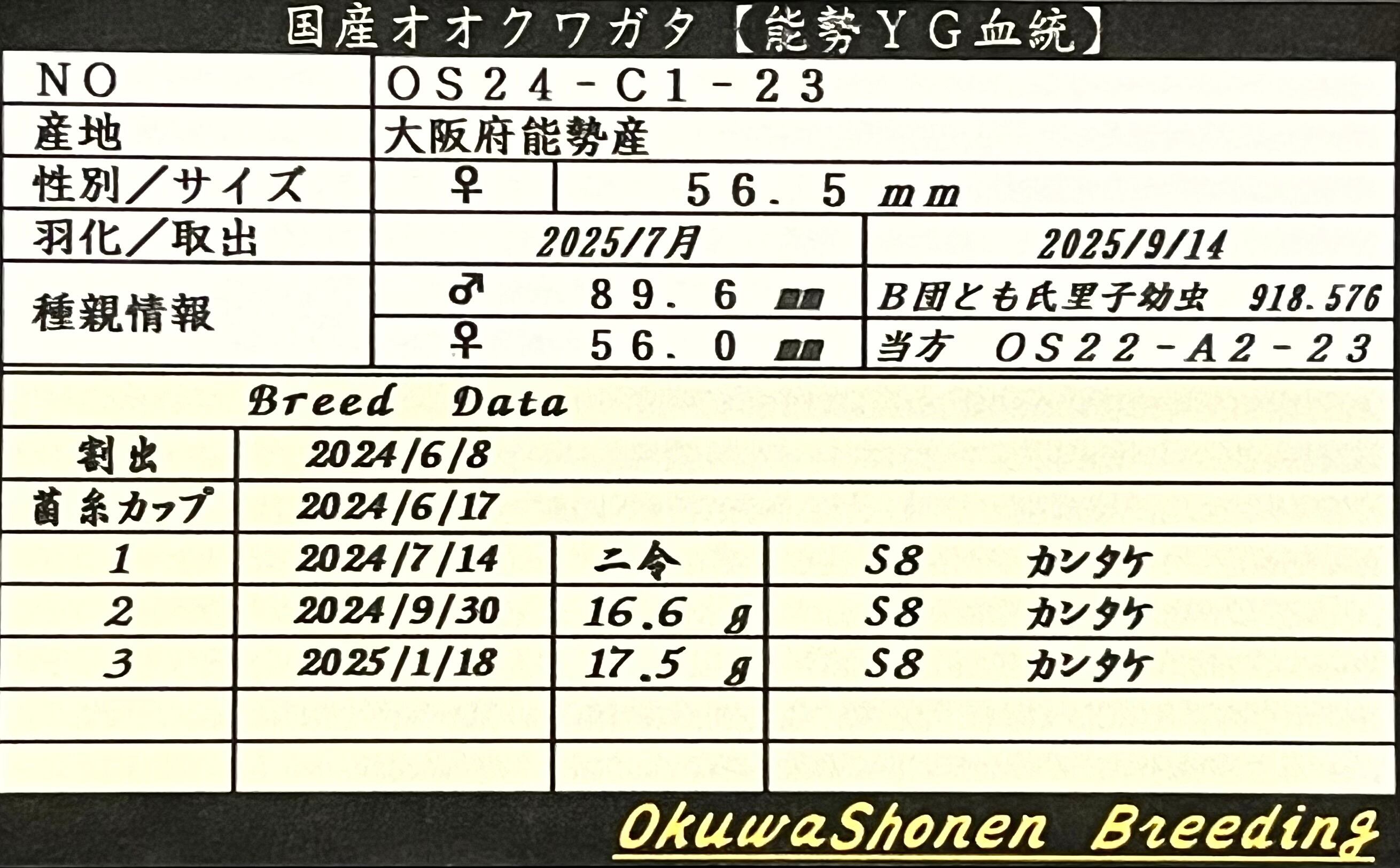 (オオクワ少年)♀56.5㎜ (C1)単品 ※90.6㎜,90.0㎜同腹 【オオクワガタ 能勢YG血統】