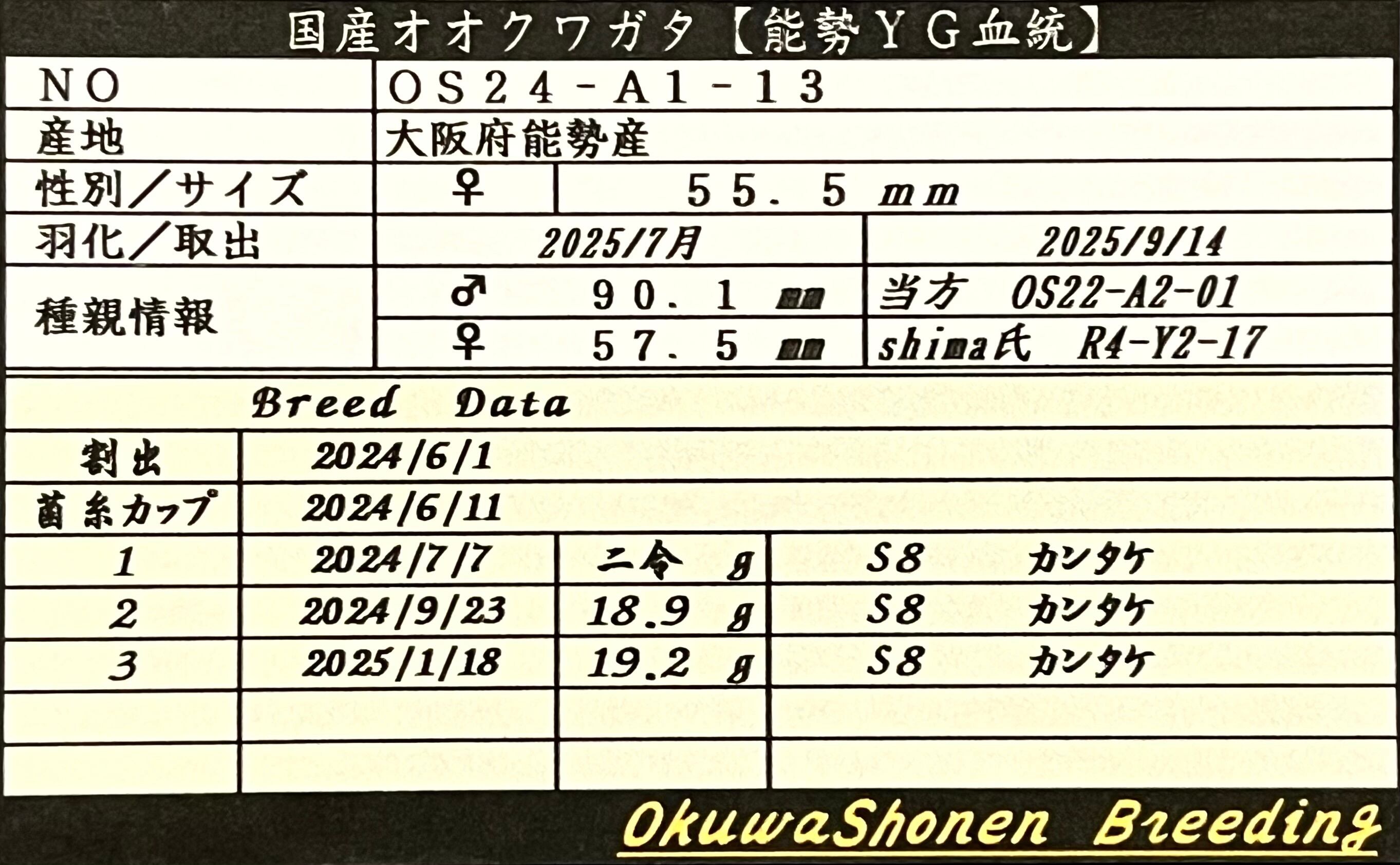 (オオクワ少年)♀55.5㎜ (A1)単品 ※90.6,90.8B㎜同腹 【オオクワガタ 能勢YG血統】