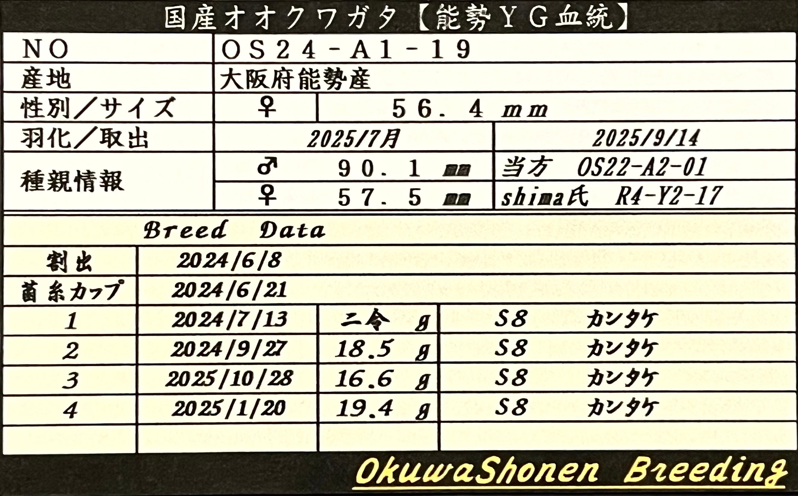 (オオクワ少年)♀56.4㎜ (A1)単品 ※90.6,90.8B㎜同腹 【オオクワガタ 能勢YG血統】
