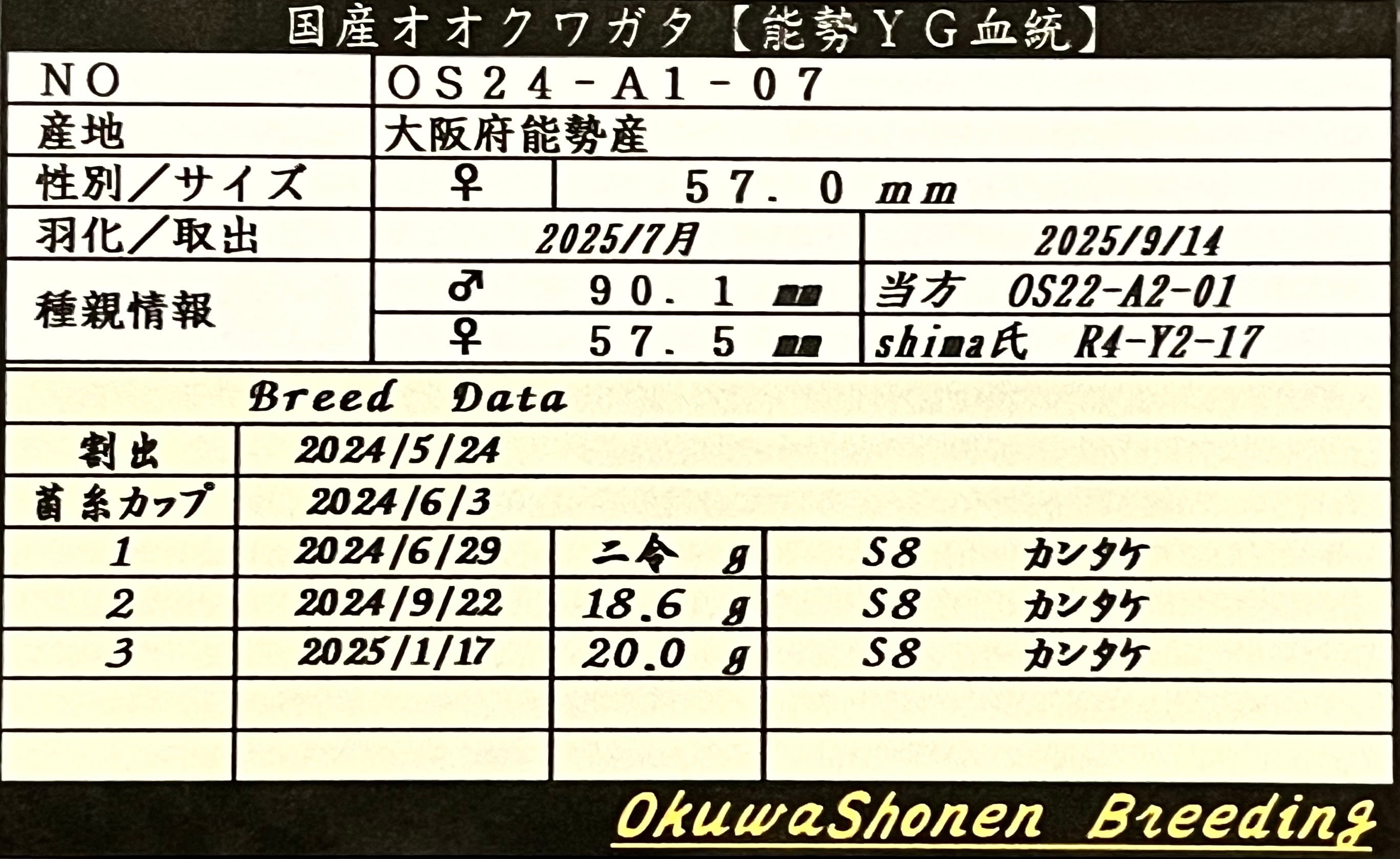 (オオクワ少年)♀57.0㎜ (A1)単品 ※90.6,90.8B㎜同腹 【オオクワガタ 能勢YG血統】
