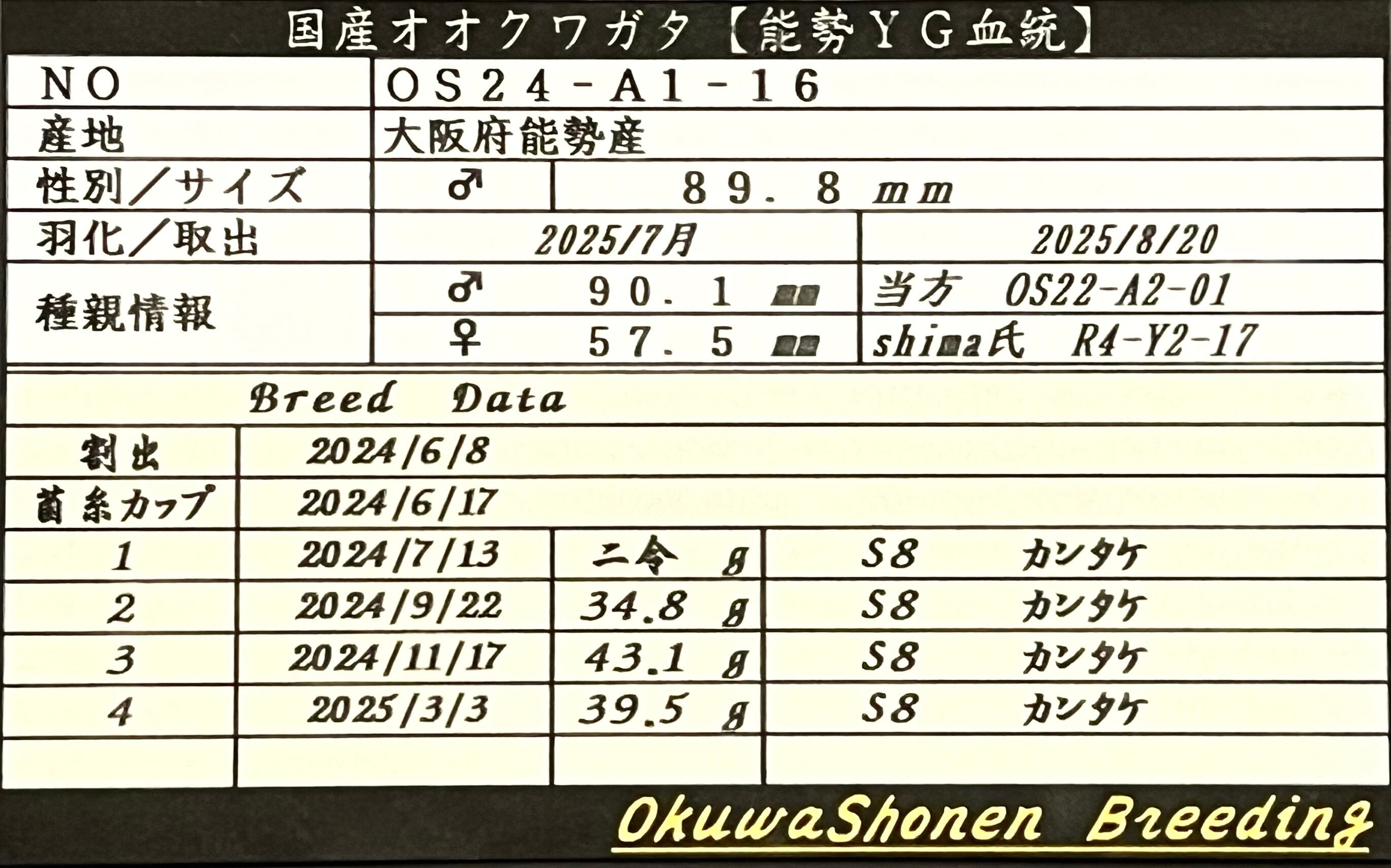 (オオクワ少年)89.8㎜ (A1)単品 ※90.6,90.8B㎜同腹 【オオクワガタ 能勢YG血統】