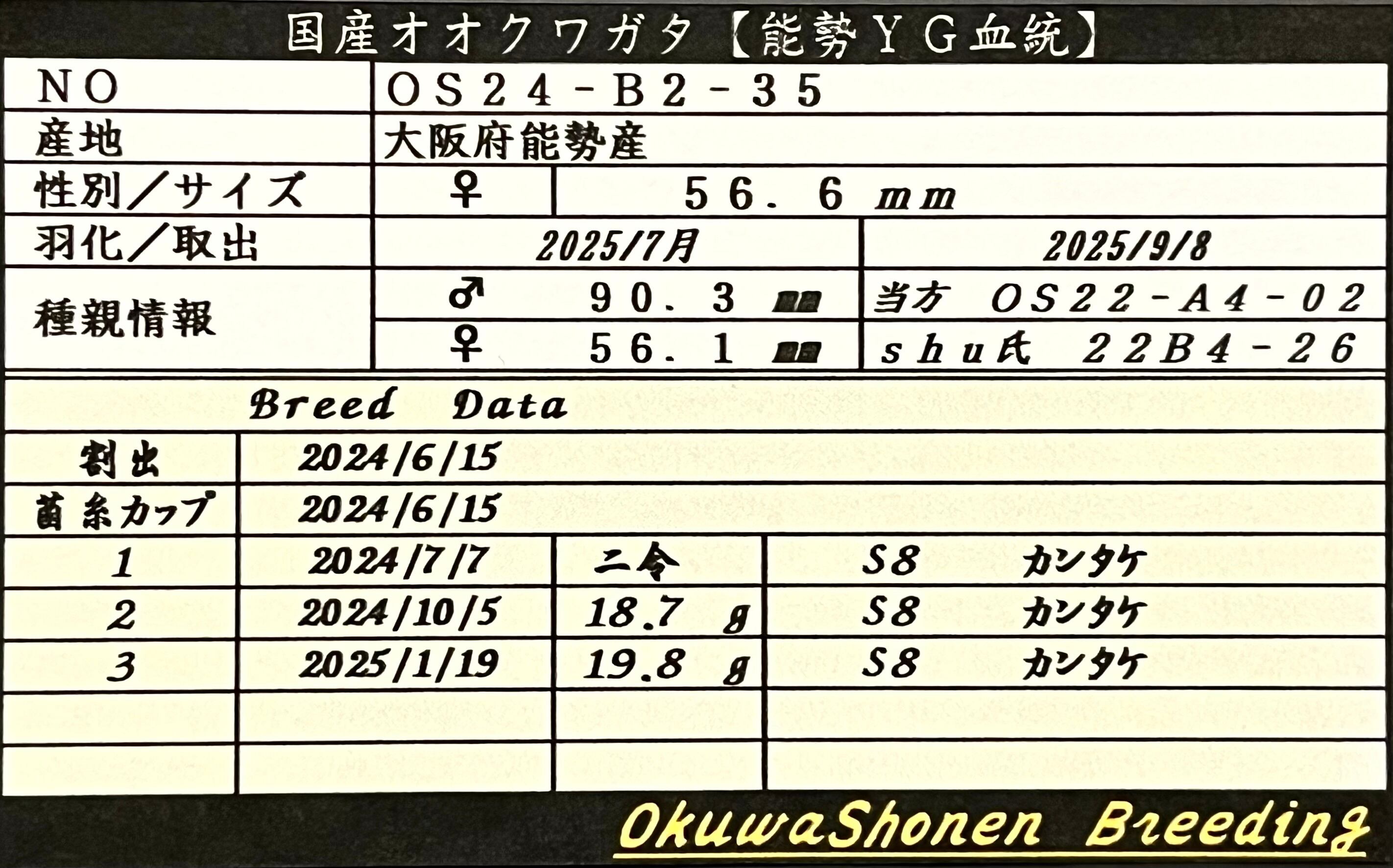 (オオクワ少年)♀56.6㎜ (B2)単品 ※91.9,91.5㎜同腹 【オオクワガタ 能勢YG血統】
