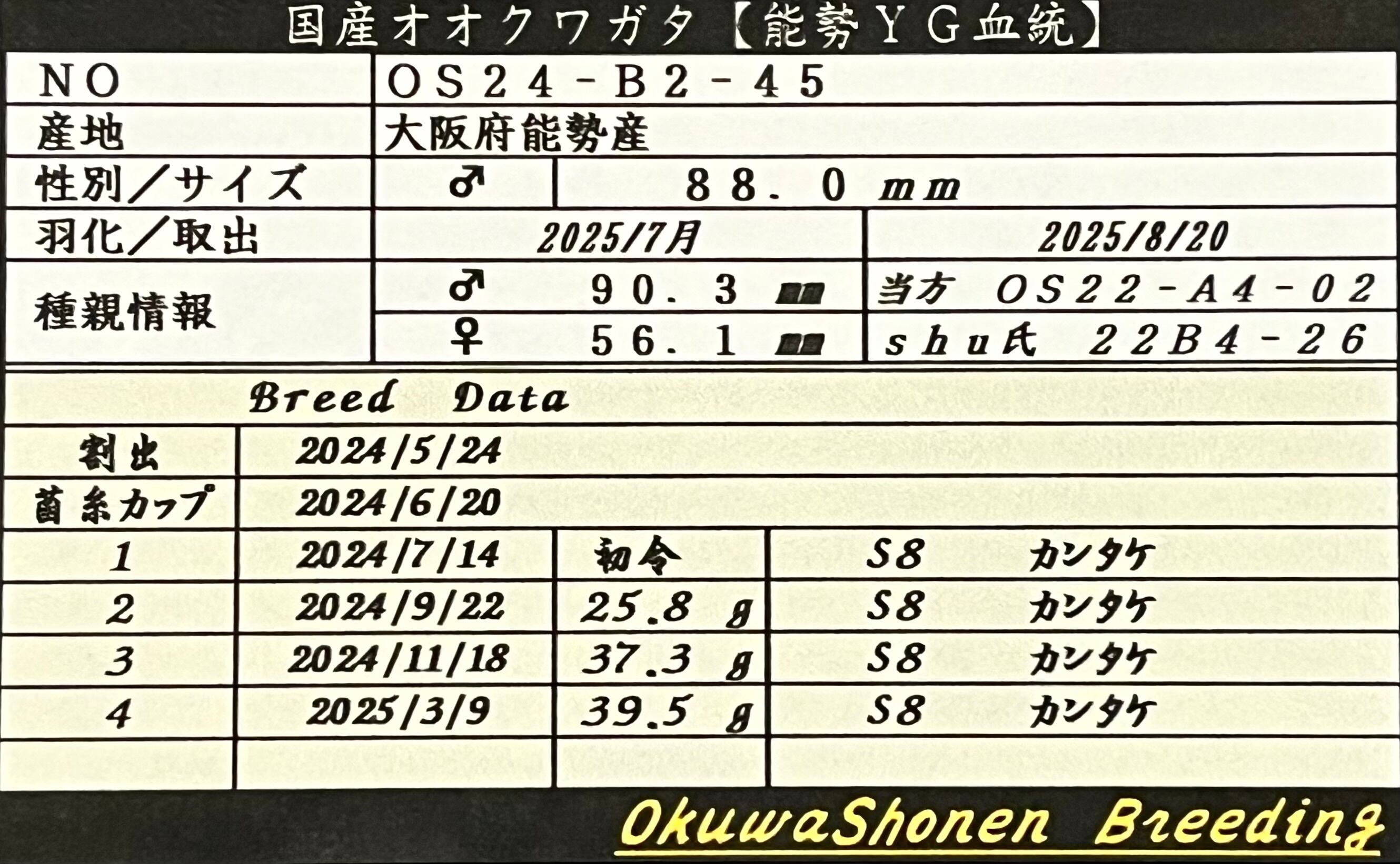 (オオクワ少年)88.0㎜ (B2)単品 ※91.9,91.5㎜同腹 【オオクワガタ 能勢YG血統】